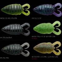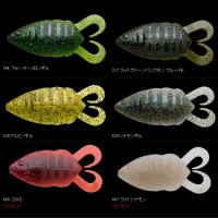 ワイド&フラット型ギル系ソフトベイトが「フリップギル」。上〜宙層にサスペンドしたブルーギルに付いたバスを釣る場合、着水音から始まるフォール主体のカバーゲームとなることが多く、「フリップギル」のナチュラルな着水音と、揺れるようなスライド&ワイドスパイラルフォールにより、着水の瞬間からビッグバスを引きつけて力強いバイトを誘発。左右に膨らませたショートカーリーテールは、ノーシンカーでは動きづらく、スライドフォールを発生させ、一方シンカーがある場合はウエイトにより明滅的スイミングを生み出す計算し尽くされた厚みと長さ。ワイドボディでありながら4/0、5/0のオフセットフックで十分なフッキング効率を得るために、数多のプロトタイプを経て完成させたボディサイズはまさに実釣第一主義の賜物です。
