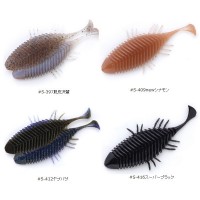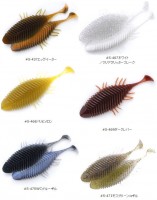 まるで三葉虫のように平たい形状のフラットヘッドゴビーだが、実際に手にしてみると意外に分厚く、その断面はゴビーシリーズ伝統の異型ヘキサゴンボディを踏襲しています。ボディに刻まれた深い逆リブがしっかりと水を掴むと同時に複雑で強い波動を発生させ、シャローはもとより15mオーバーの超ディープでもバスに気づかせ、リングワーム系独特の本気食いを誘います。ボディは単体で14g弱もあり(4インチ)、ノーシンカーリグでも納得のロングキャストを実現。深い逆リブ構造が厚いボディを曲げやすくさせるため、口の中で簡単に畳まれ抜群のフッキング性能も発揮します。フックポイントをしっかり隠せるスリット、スキッピングでも反らない肉厚ボディなど、実戦テストで鍛え上げられた高度な汎用性を保持。ノーシンカーリグ(ネイル入)のパワーグライドフォールが最大の特徴ですが、テキサスリグ、フットボールヘッドリグにも抜群の相性のよさを持っています。